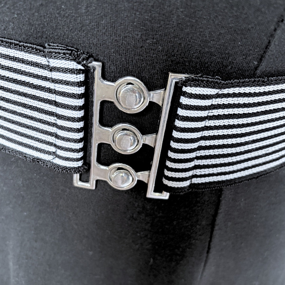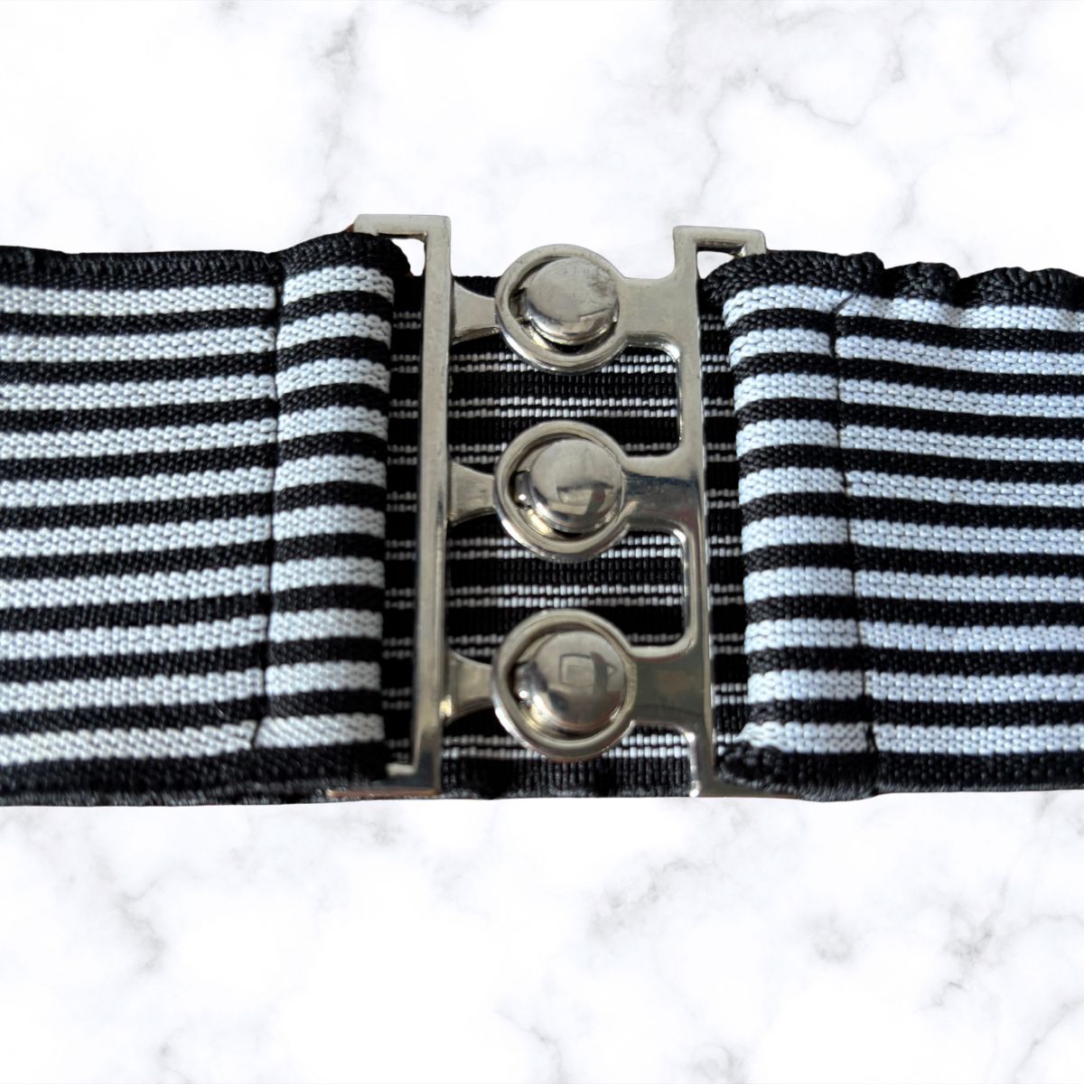 - Black and off white stripe stretchy 80s waist belt with a metal clasp