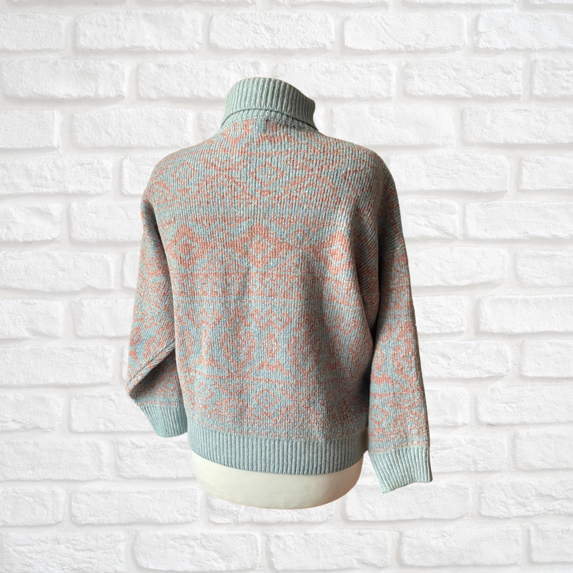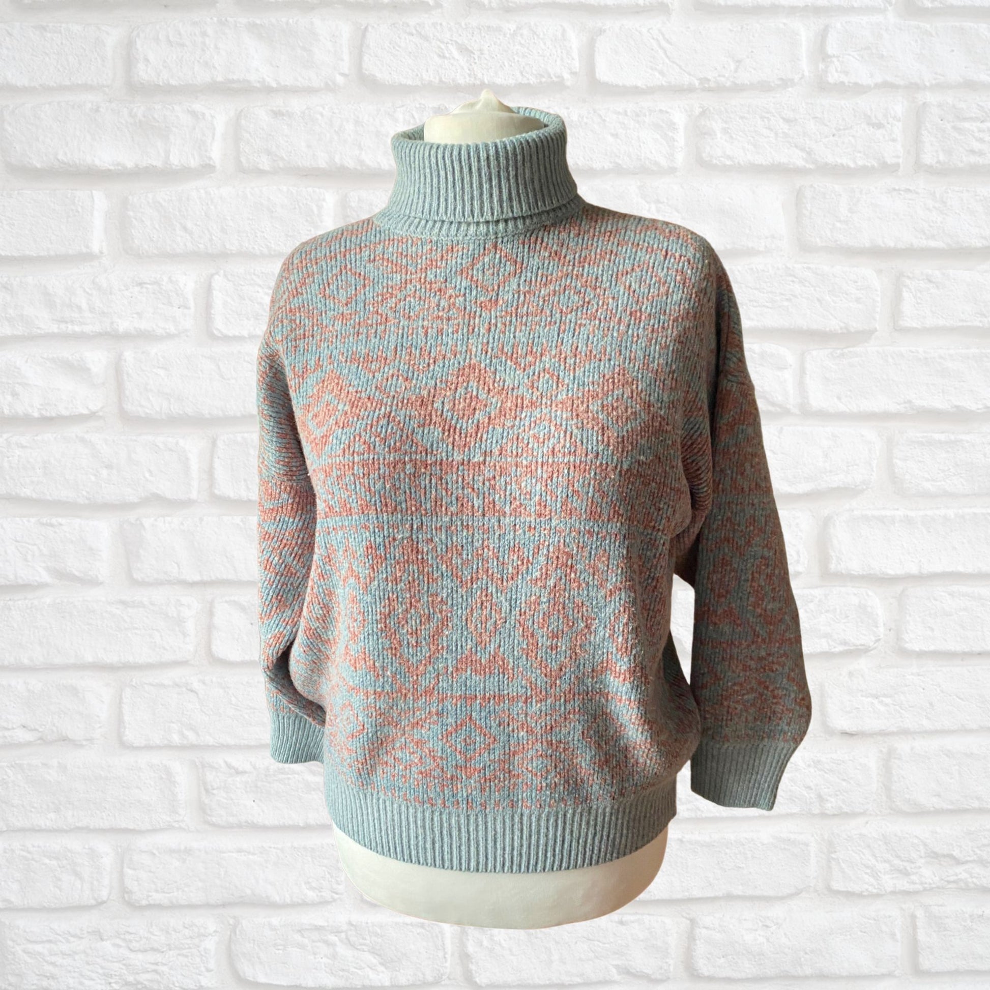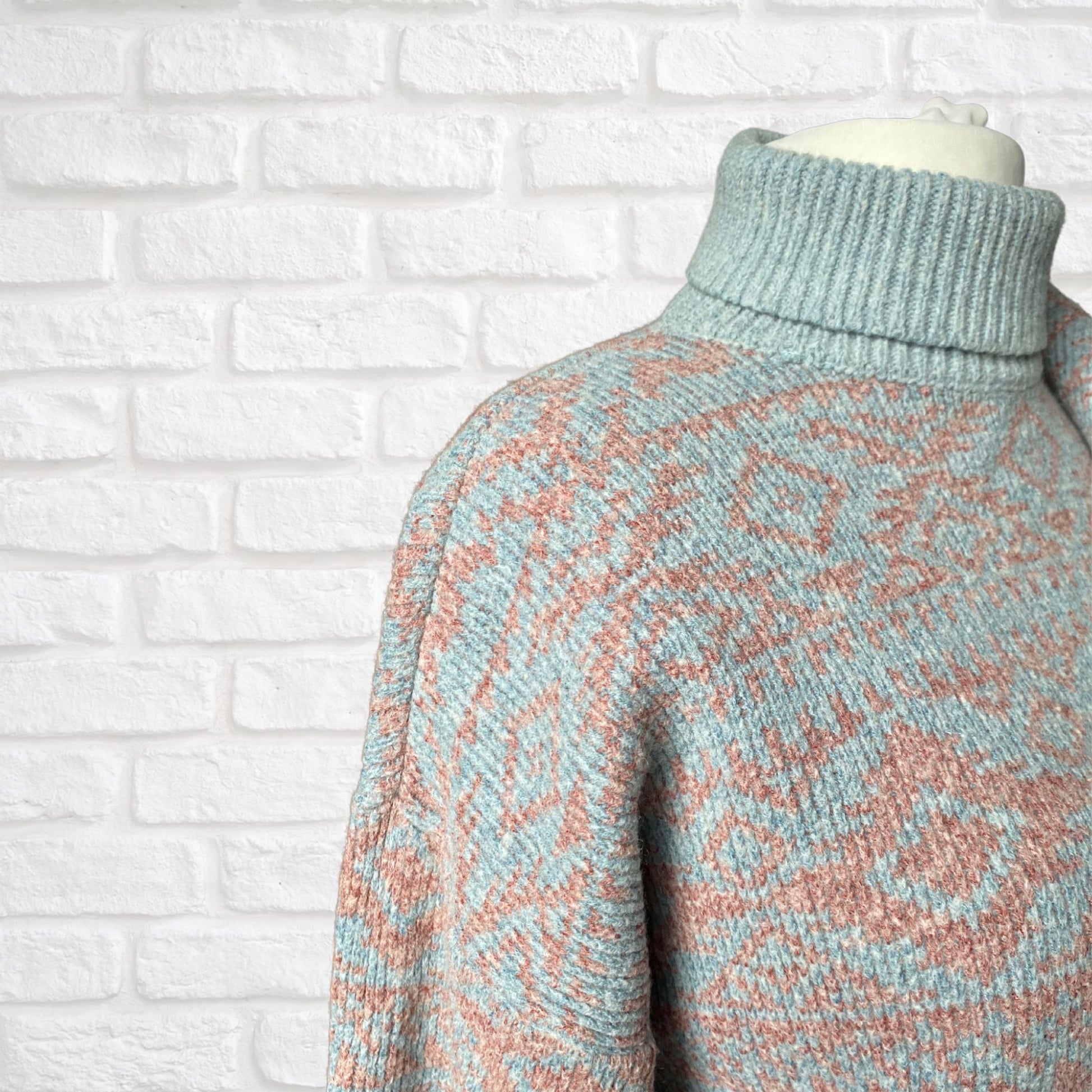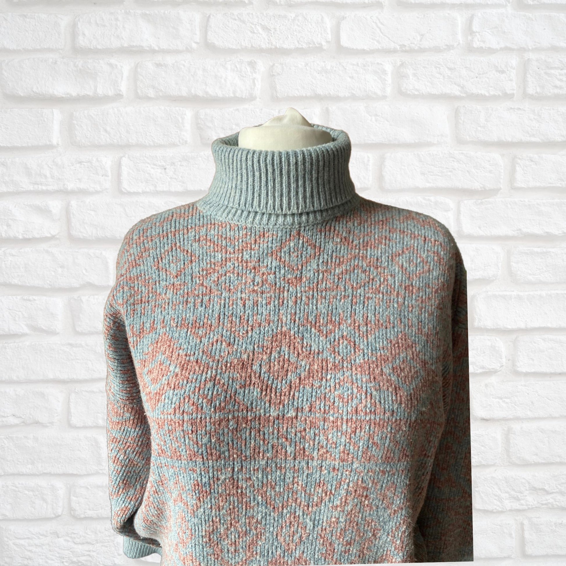 Vintage 80s Pale Blue and Pink Roll Neck Jumper. Approx UK size 18-22