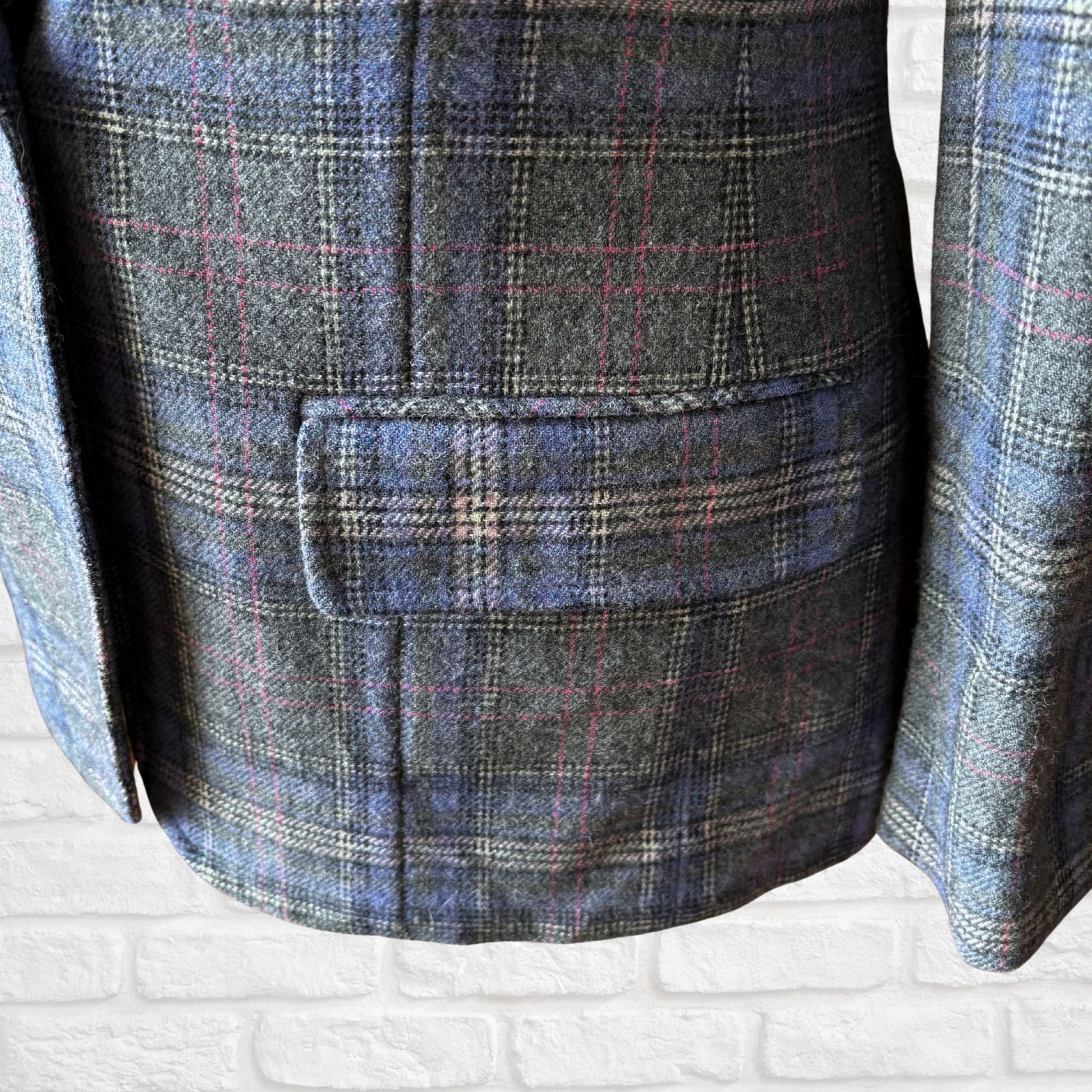 This beautiful classic plaid wool jacket in dark grey, blue, white, and pink is the perfect addition to your wardrobe. Traditionally made this quality, preppy style blazer works perfectly with jeans and a crisp shirt or cute with a mini skirt. The perfect blend of 80s nostalgia and modern style.