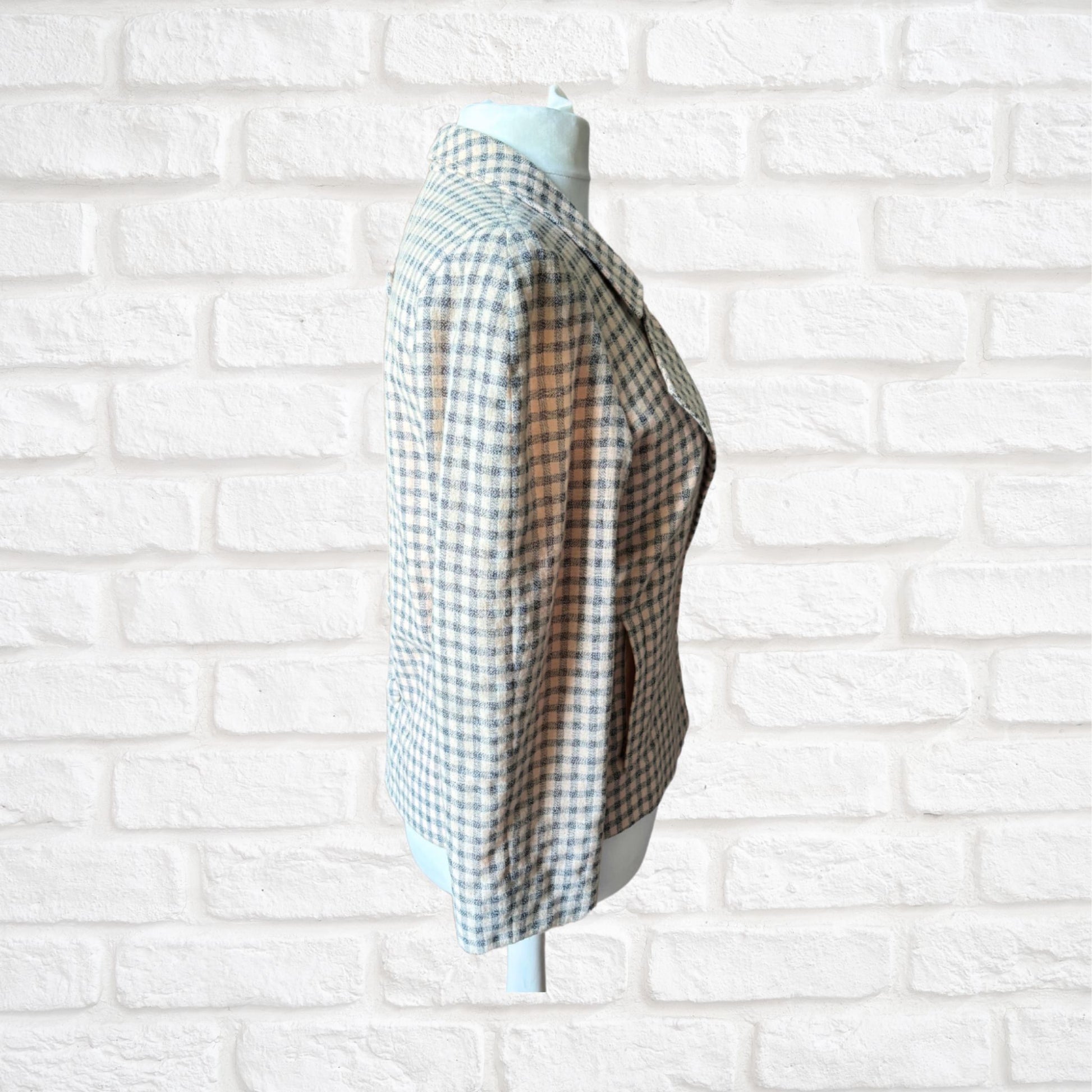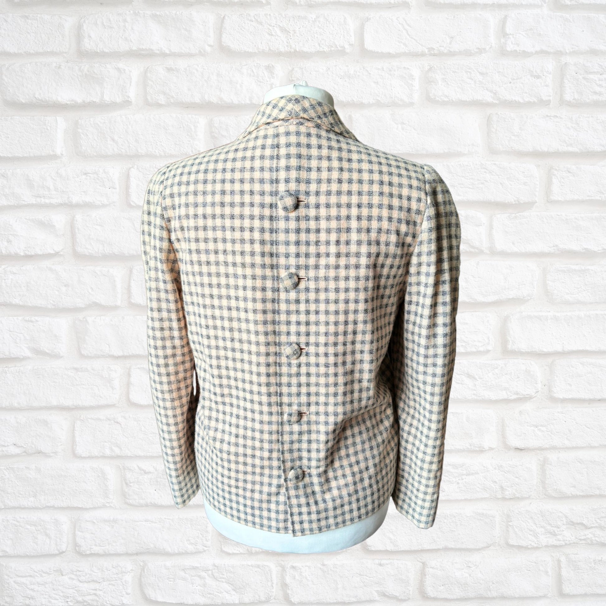 This fabulous 80s pink and grey gingham blazer will transport you back to the era of bold fashion statements. With its preppy style design and cute detailing this jacket will be the perfect addition to your Spring wardrobe.