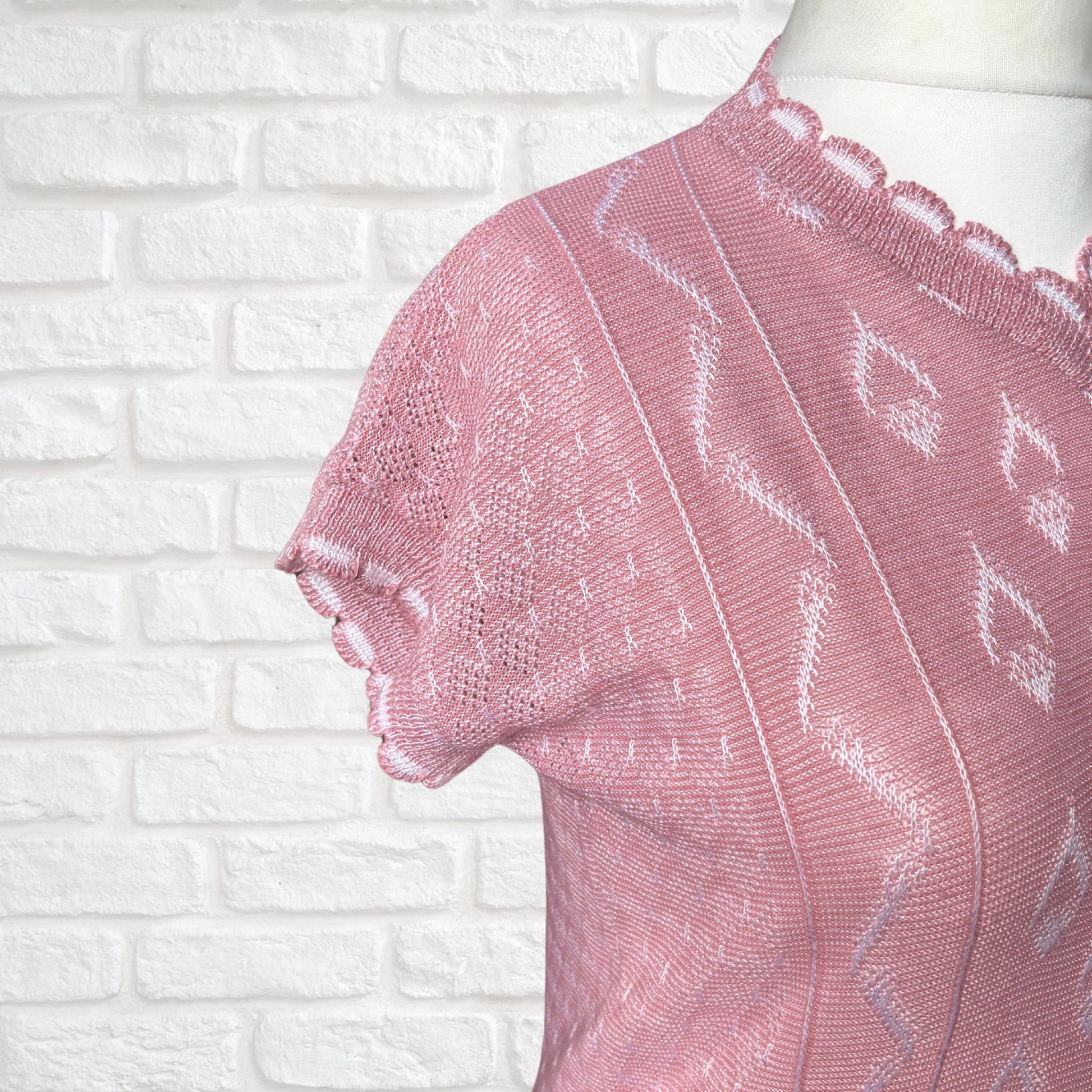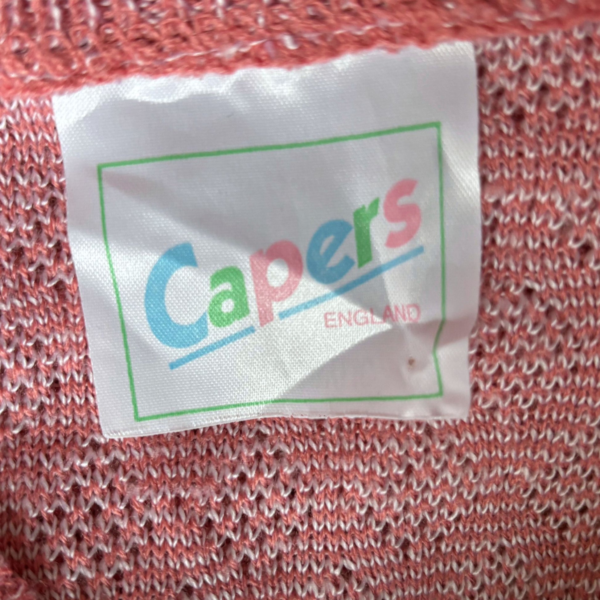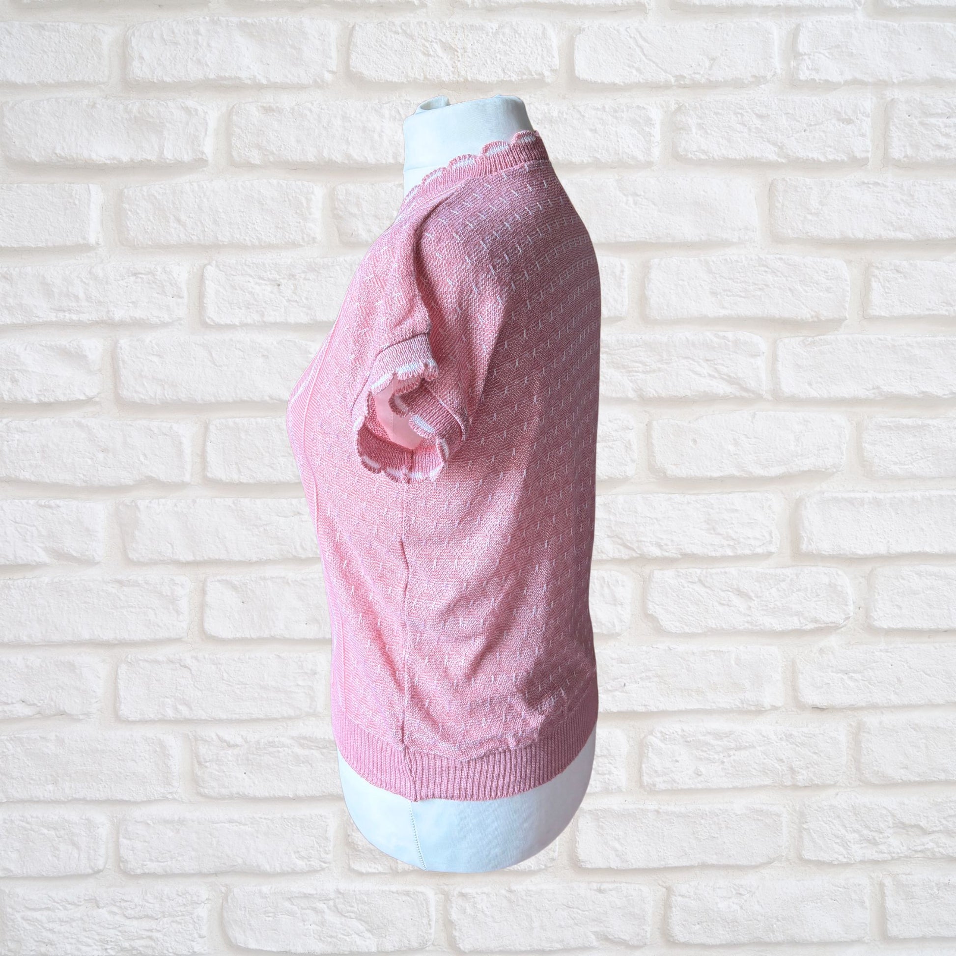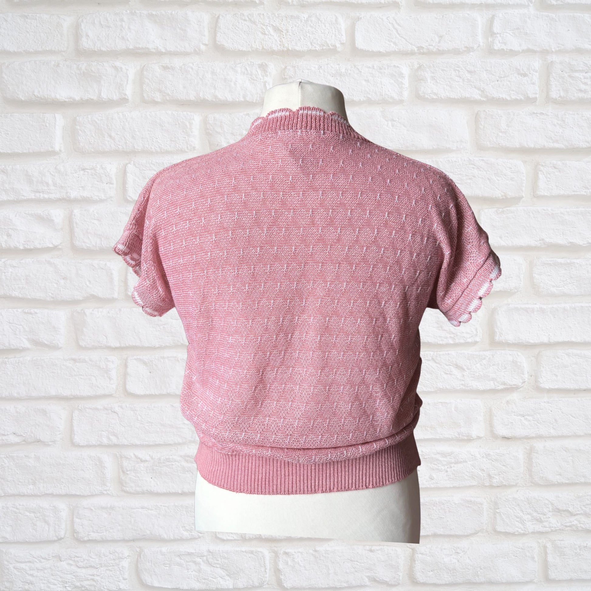 This delightful 80s cap sleeve pink and white jumper will make a charming addition to your vintage wardrobe. With its lightweight,easy to wear design, this vintage knit is perfect for adding a touch of retro flair to your outfits.