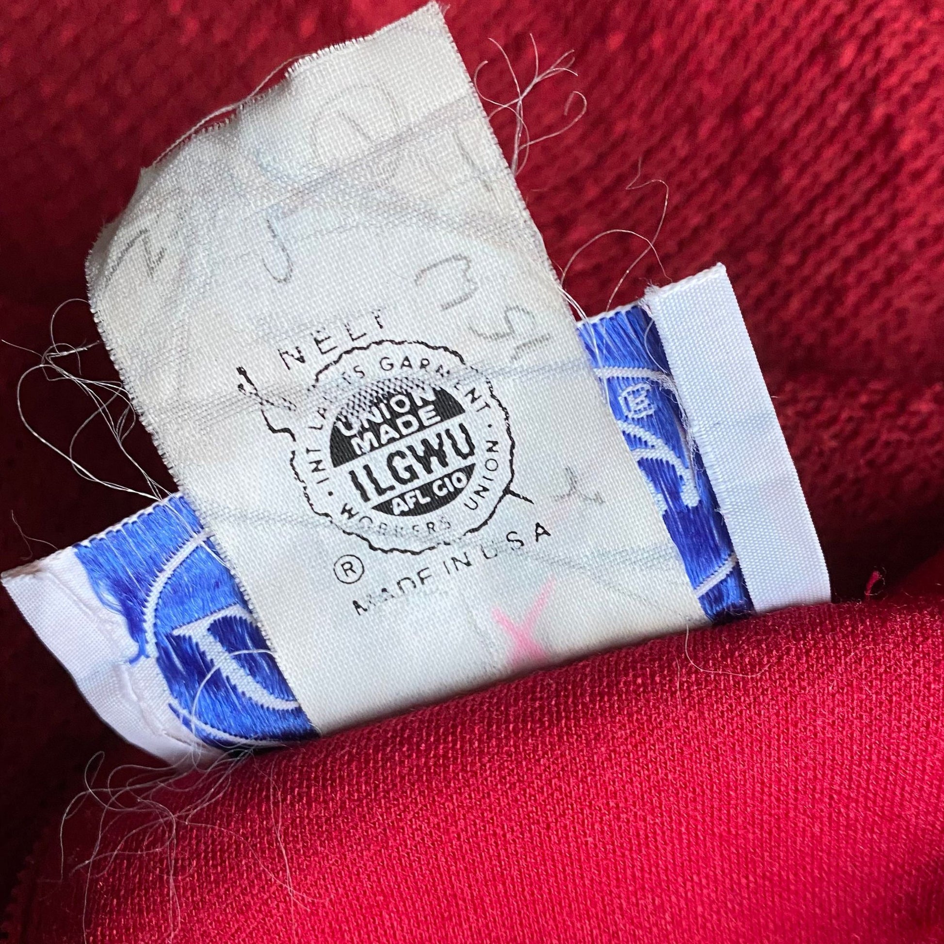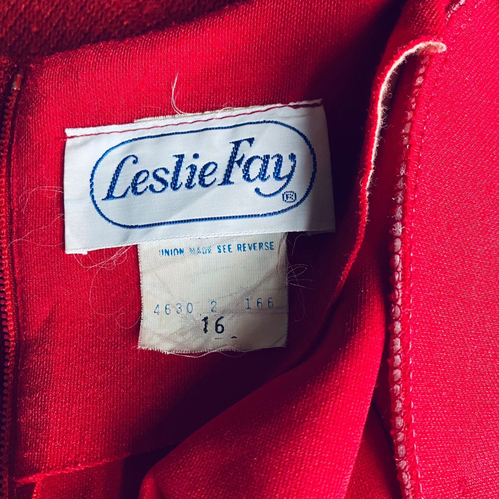 This vintage red midi dress, made in the USA by Leslie Fay, boasts a thoughtful design that combines classic elements with unique details.