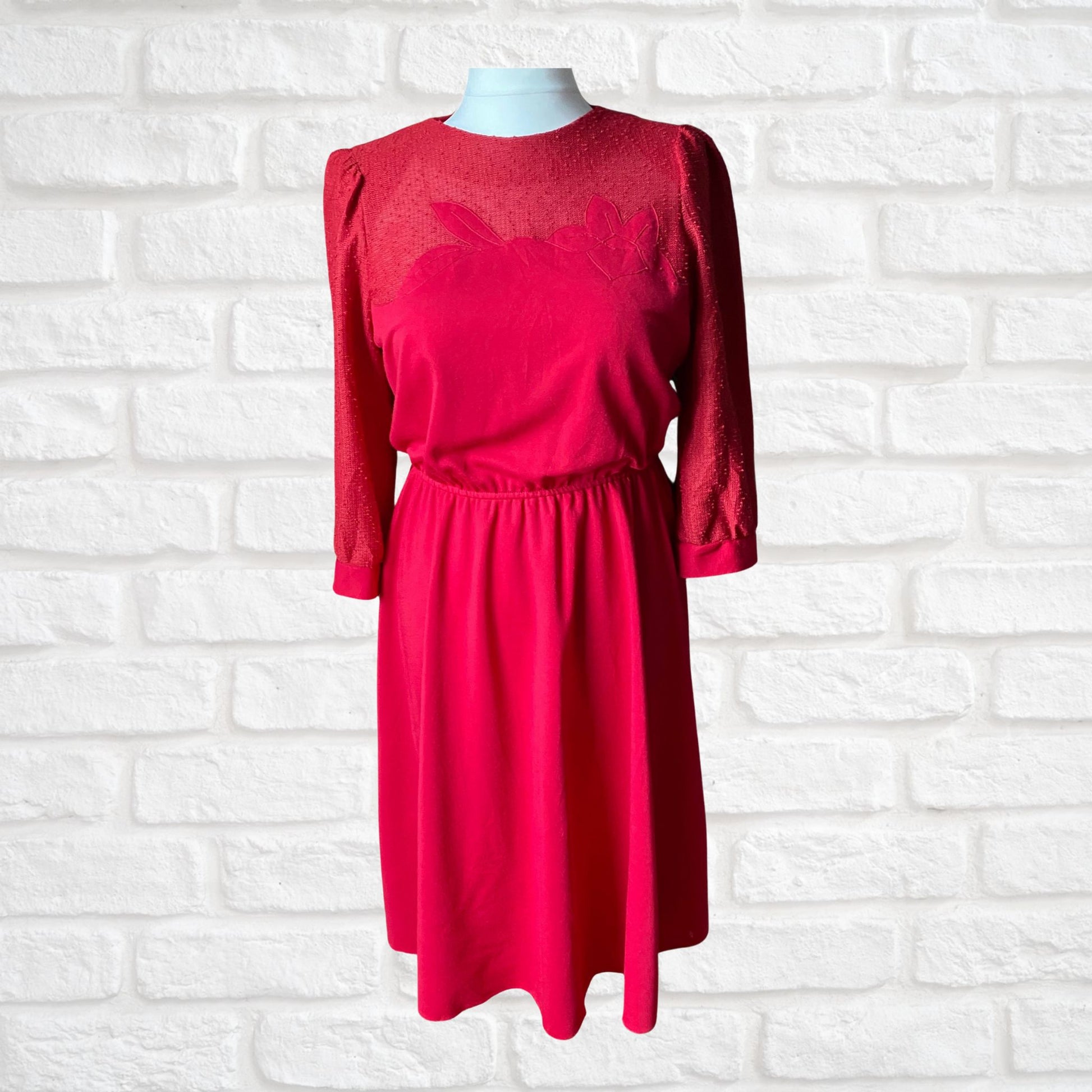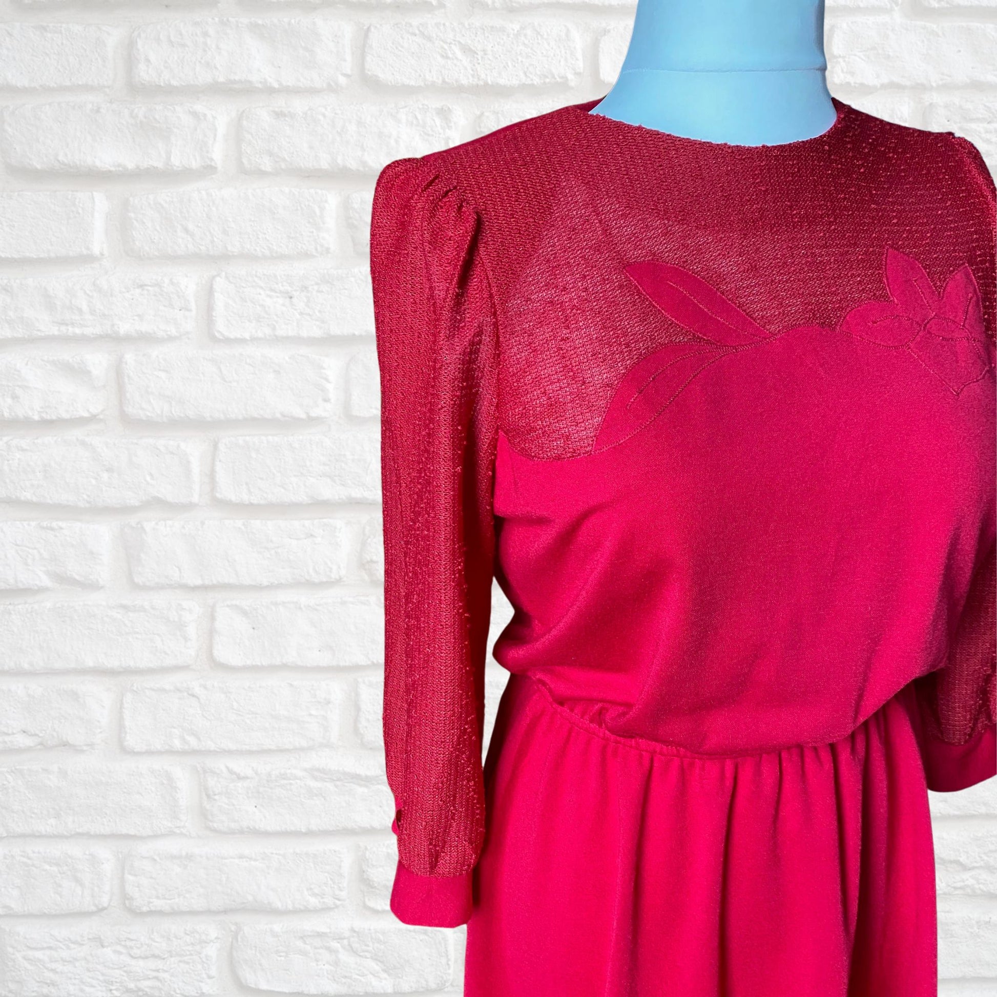 Vintage 80s Red Midi Dress with Bracelet Length Sleeves by Leslie Fay. Approx UK size 14-16