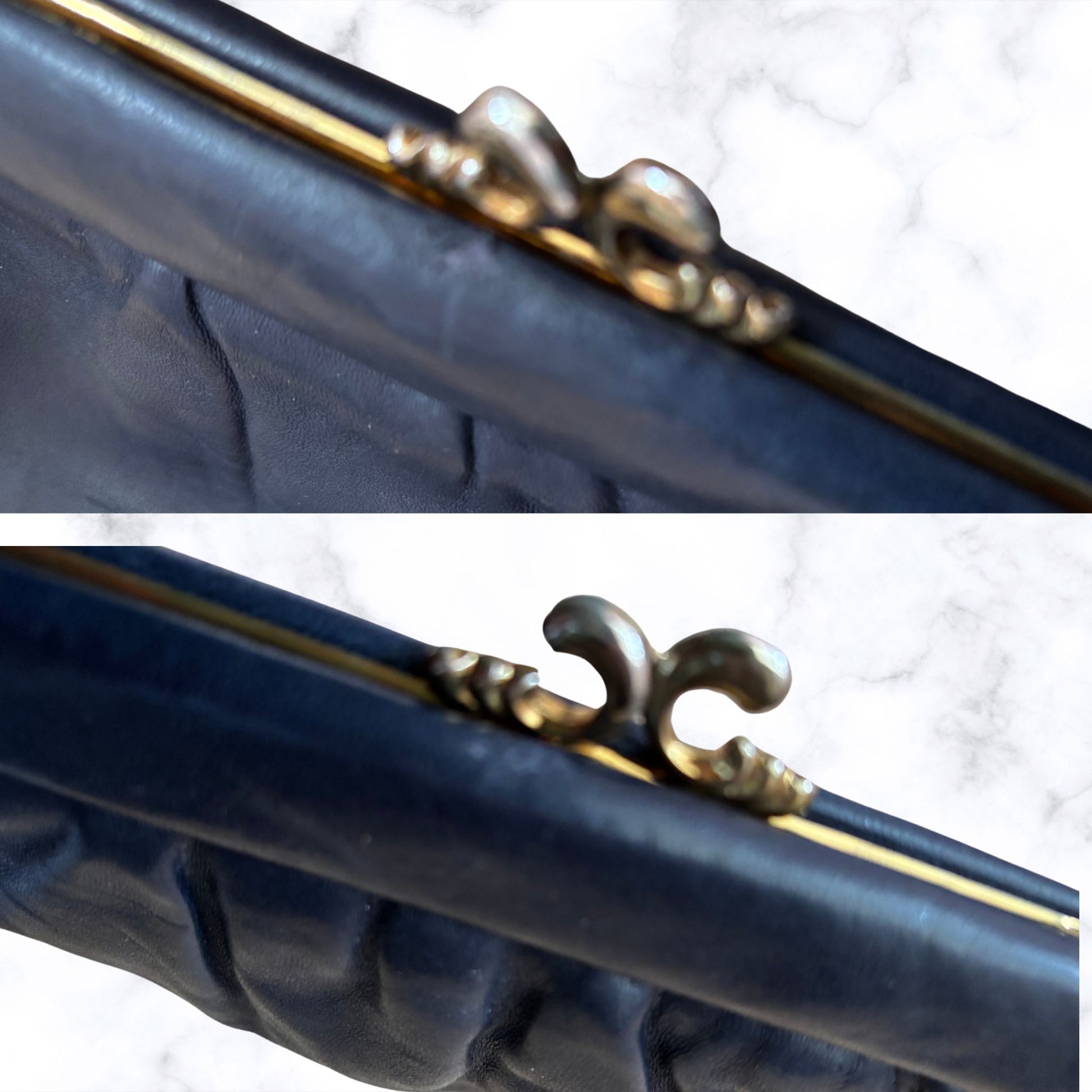 This chic 60s style navy blue leather vintage bag fastens with a gold toned ornate kiss lock and can be used as an elegant clutch or perhaps as a large coin purse. Big enough to fit the essentials in, it is perfect for special occasion, such as a wedding or night out.