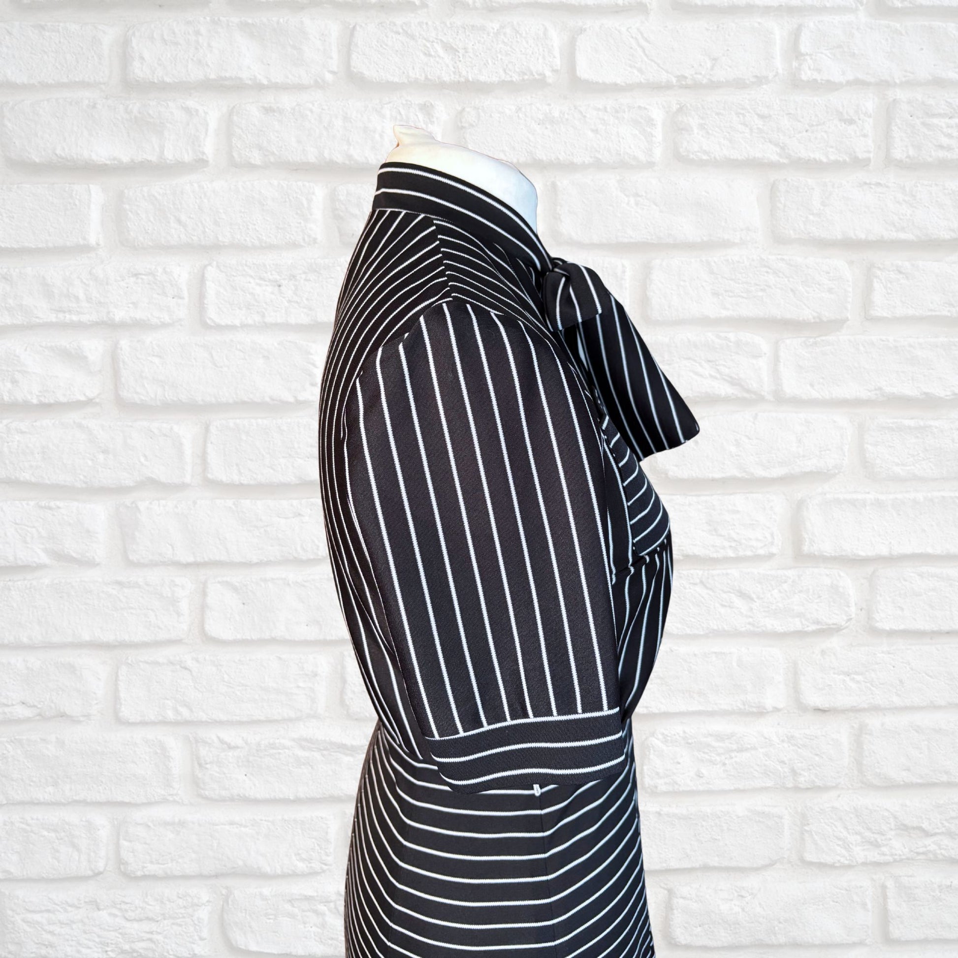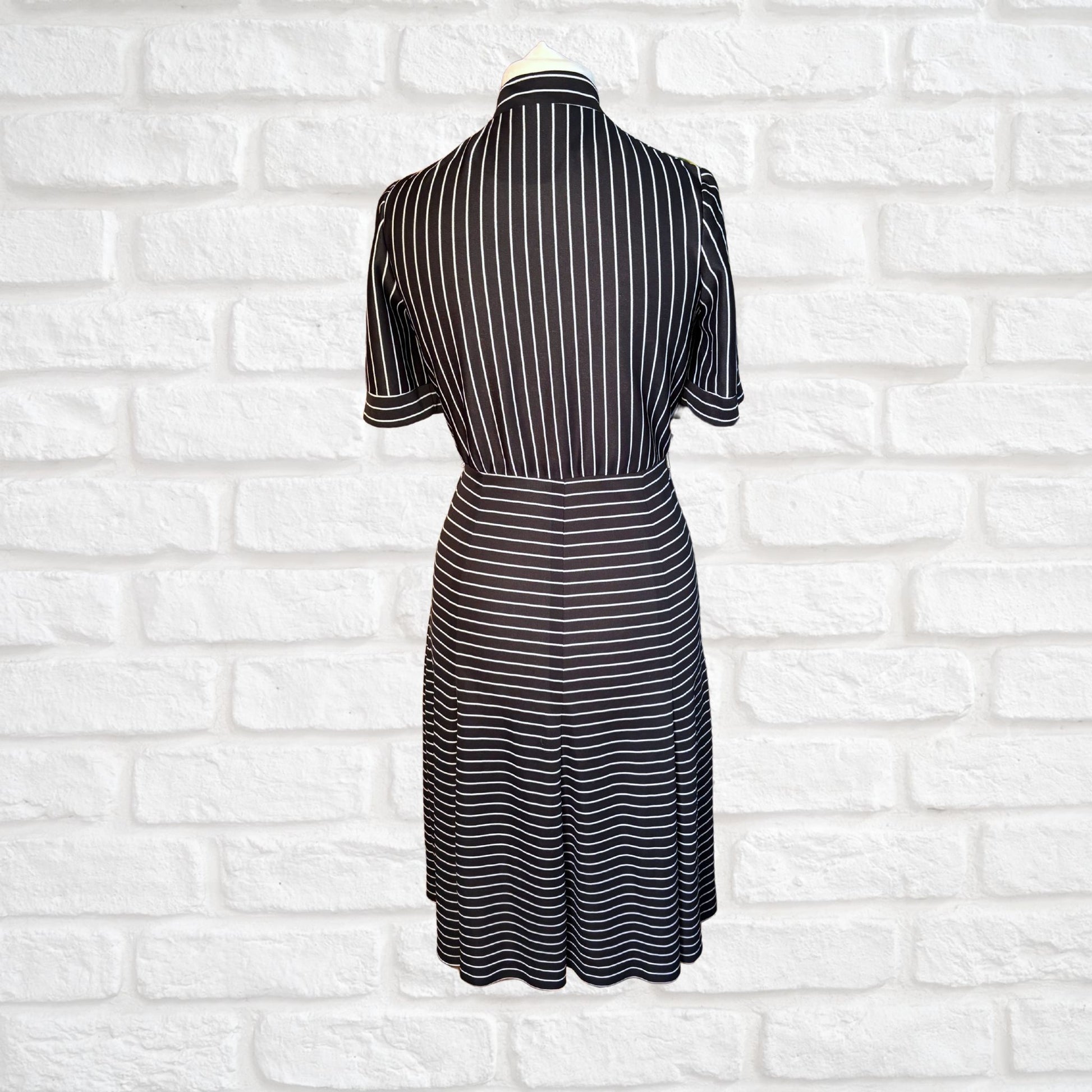 This striking black and white striped vintage dress with its flattering fit and flare shape, stylish tie collar and cute pocket is perfect for wearing everyday but smart enough for the office or a special event.