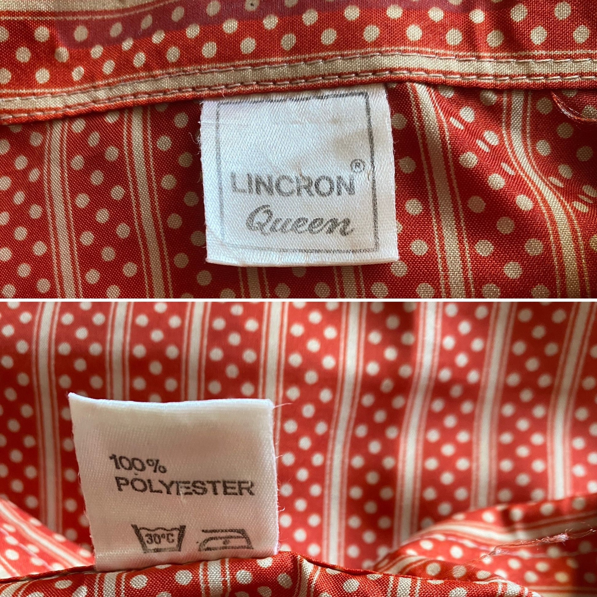 This stunning red and gold patterned vintage dagger collar shirt will transport you back to the vibrant fashion era of the 1970s. With its eye-catching colours, elegant vertical stripes, and playful polka dot pattern, this blouse is a true statement piece. Pair with a pinafore or skirt to create a cute and stylish outfit , perfect for the office or a day out. Alternatively, wear with jeans for a more relaxed weekend look.
