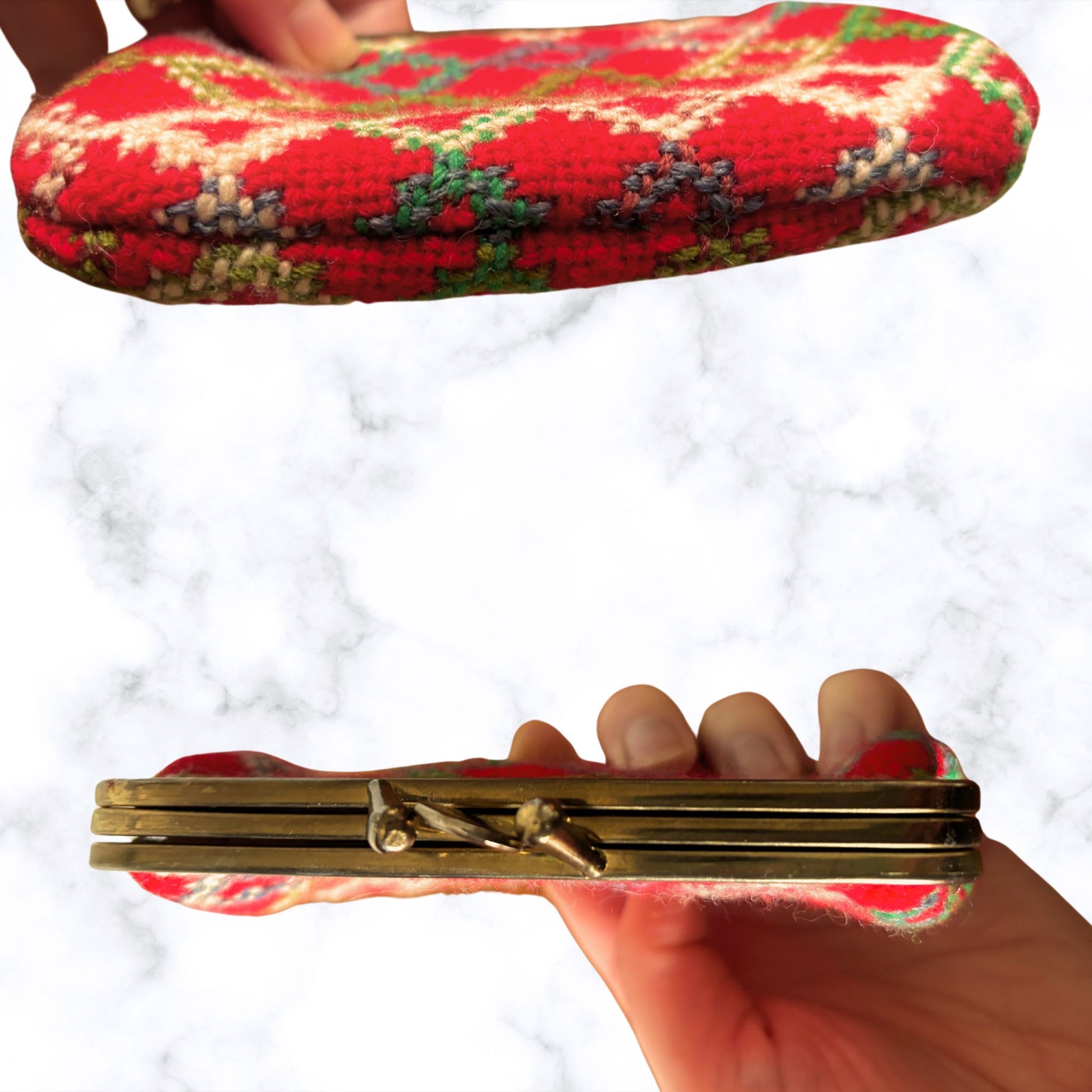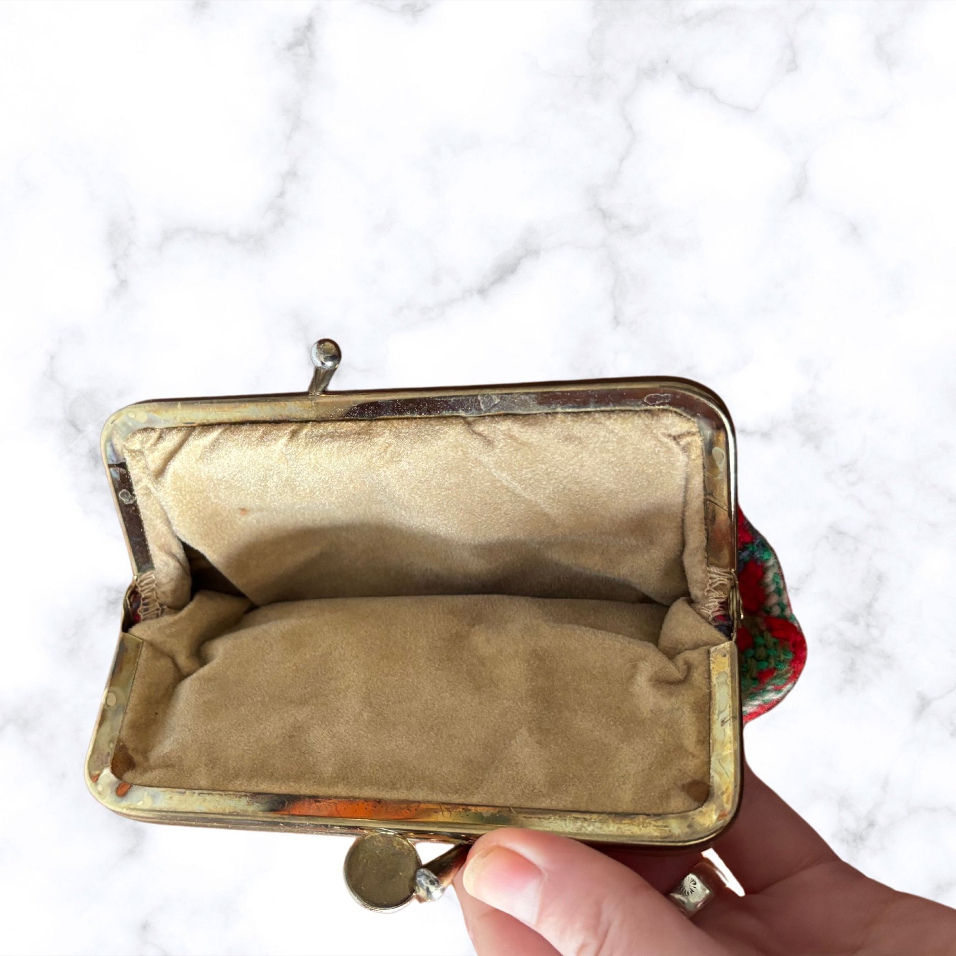 This gorgeous vintage purse features a vibrant tapestry design that captures the eye with its red, white, blue and green tones, mounted on a gold-coloured frame with a traditional kiss lock clasp. Inside, you'll find two spacious compartments lined with soft beige fabric offering a soft and secure space for your belongings.