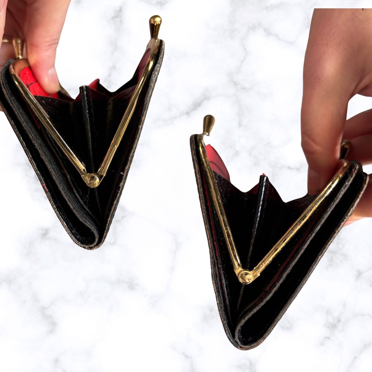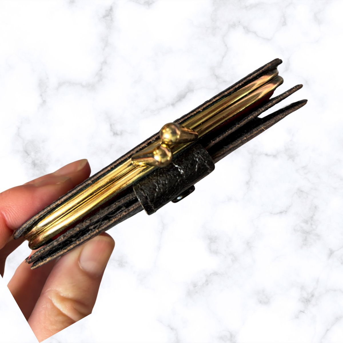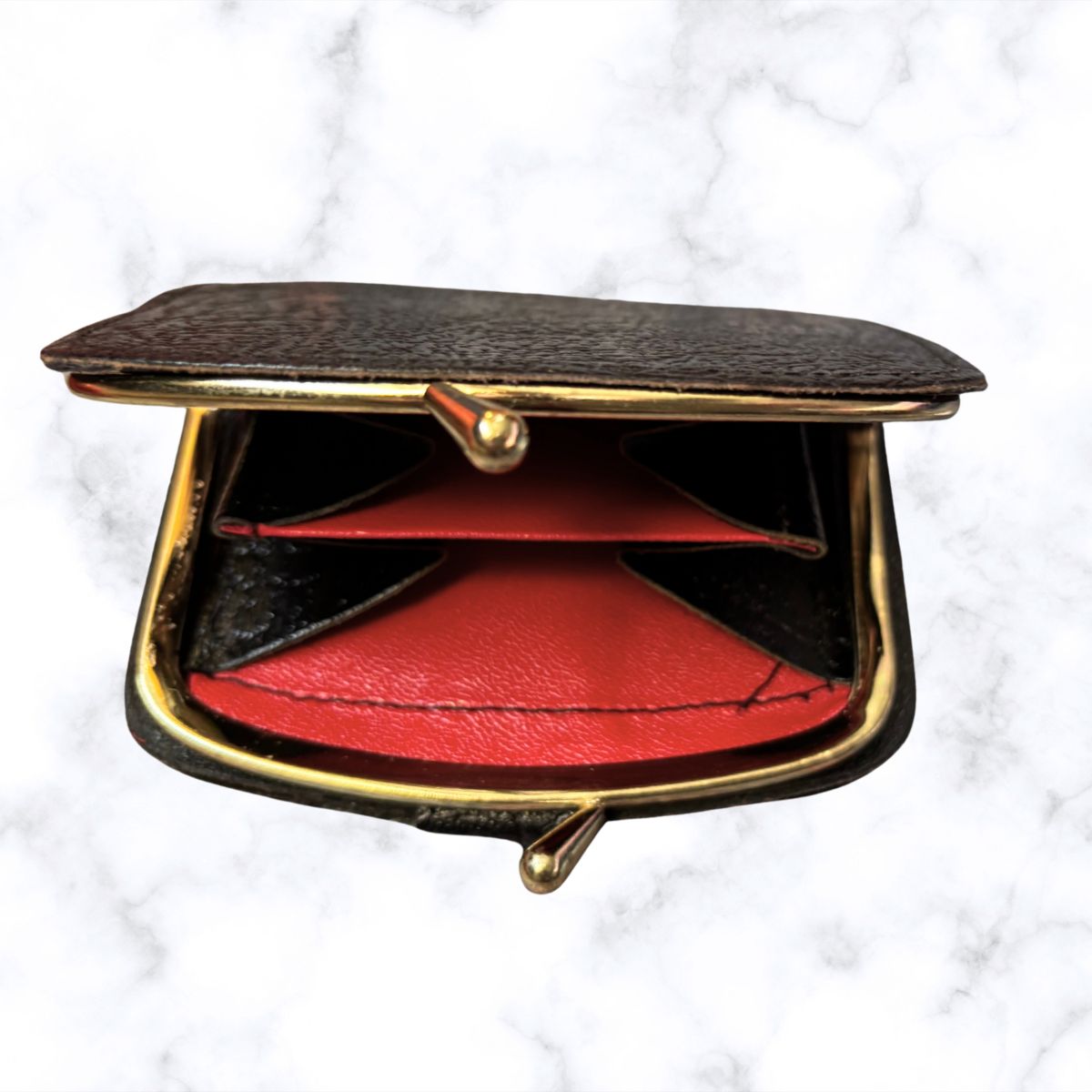 The gold tone metal frame on the back adds a touch of elegance, opening with a kiss lock to reveal two red leather lined pockets for coins.
