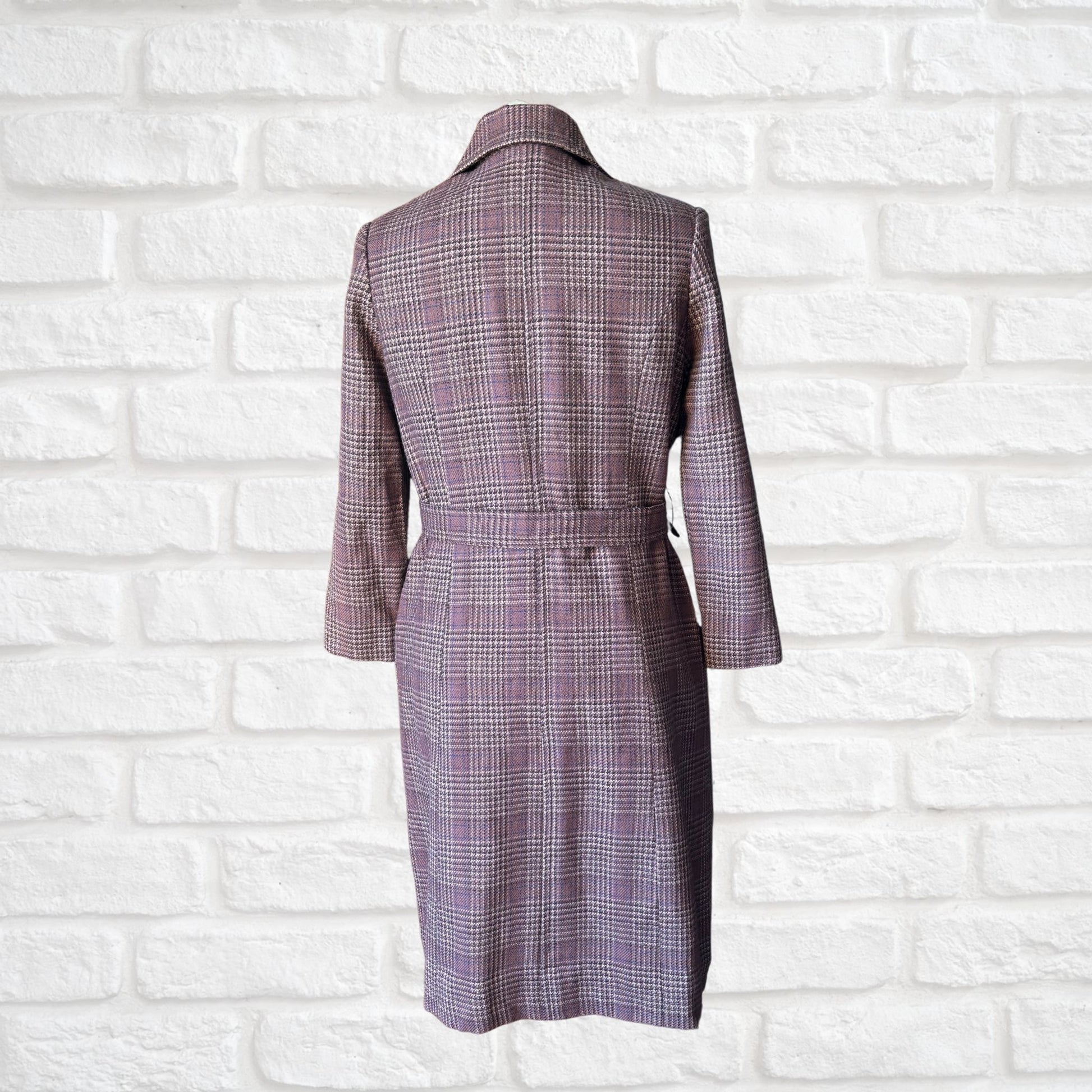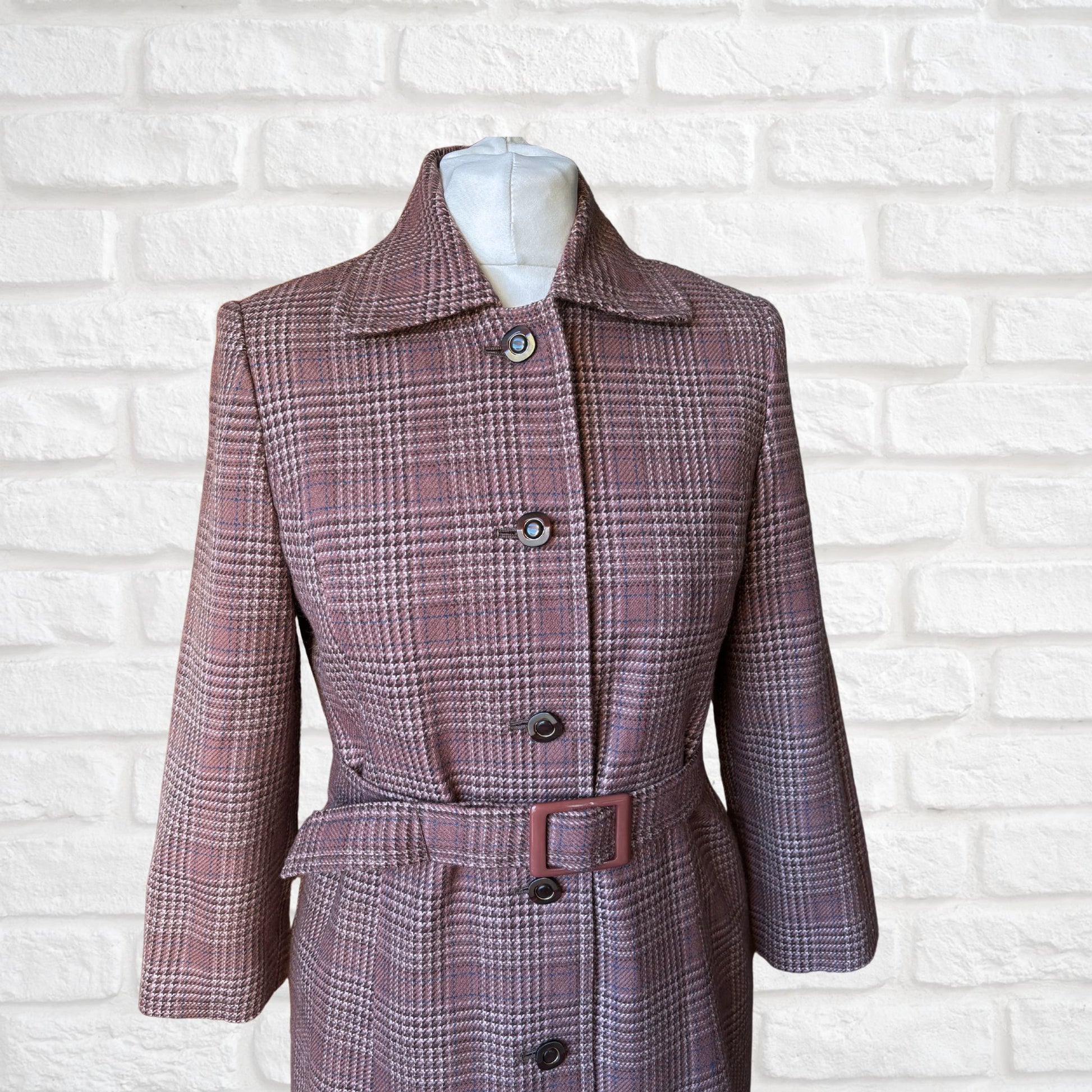 Vintage Wool Blend Trench Coat - Brown, Blue & White Checked Pattern with Matching Belt . Approx UK size 8-10