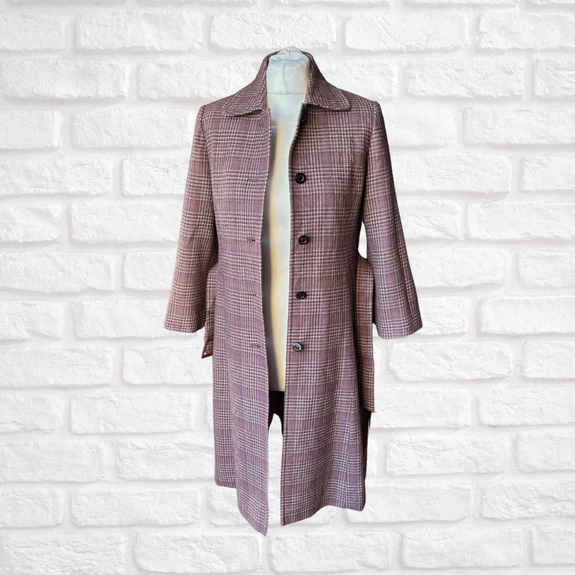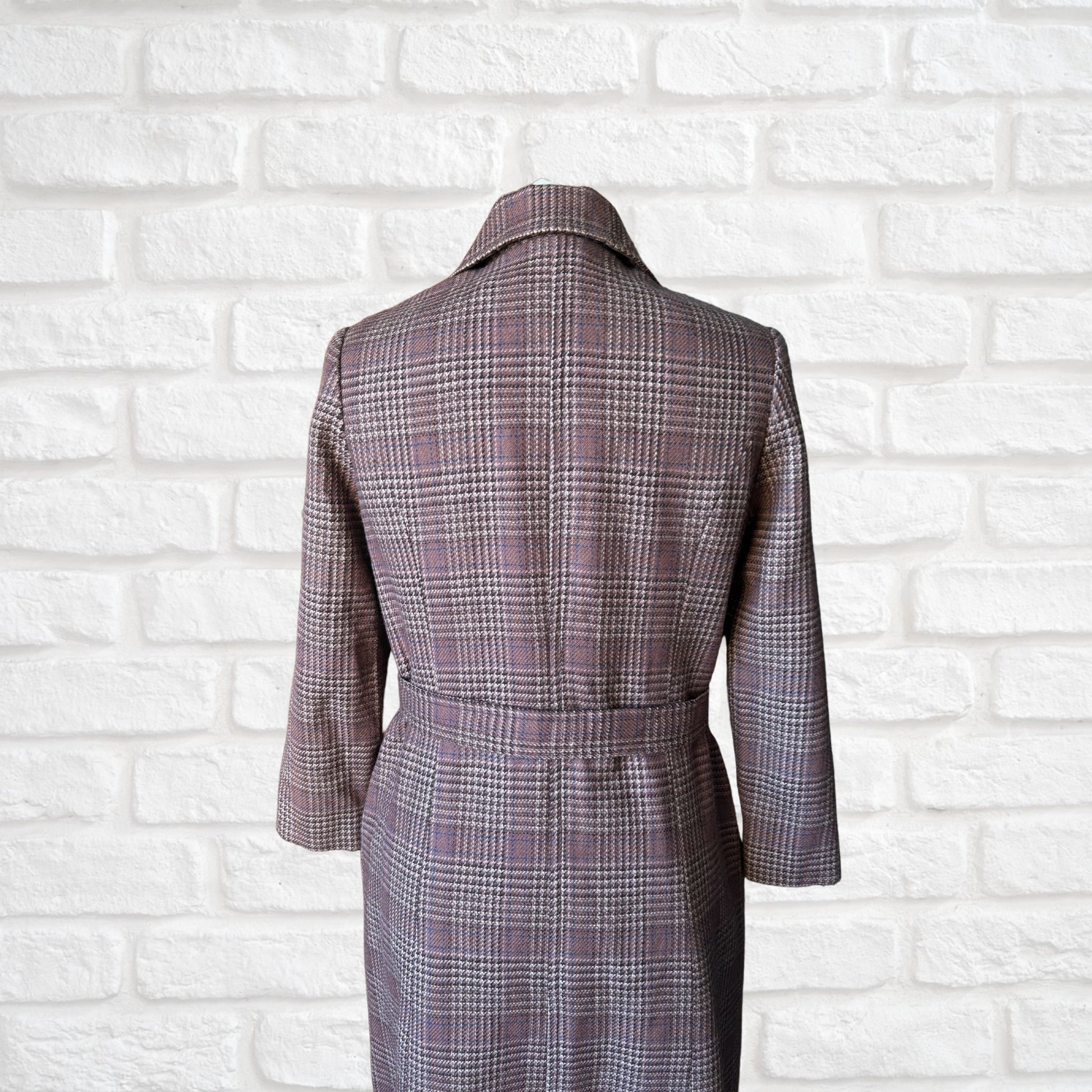 This beautiful lightweight vintage coat is the perfect combination of classic style and modern versatility. The elegant brown, blue, and white checked pattern and flattering detailing make this wool blend mini trench the perfect addition to your Spring wardrobe.
