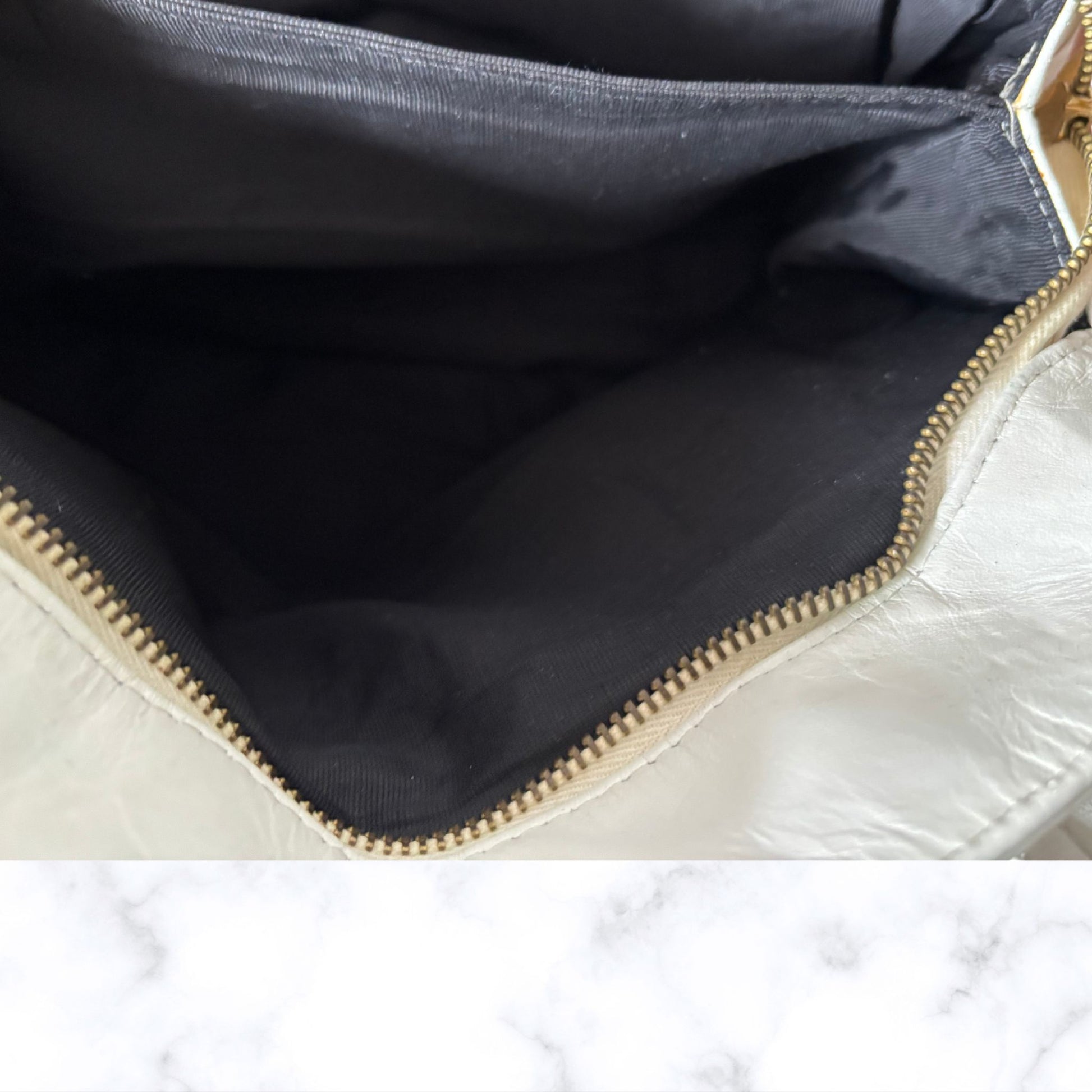 Make an elegant fashion statement with this fabulous white leather vintage handbag with contrasting pale gold coloured metal hard wear. . This fantastic mod style bag offers versatility, allowing you to wear either as a top handle or shoulder bag due to the detachable strap. The zip fastening reveals a spacious interior with a smaller zip pocket providing ample secure storage space for your essentials.